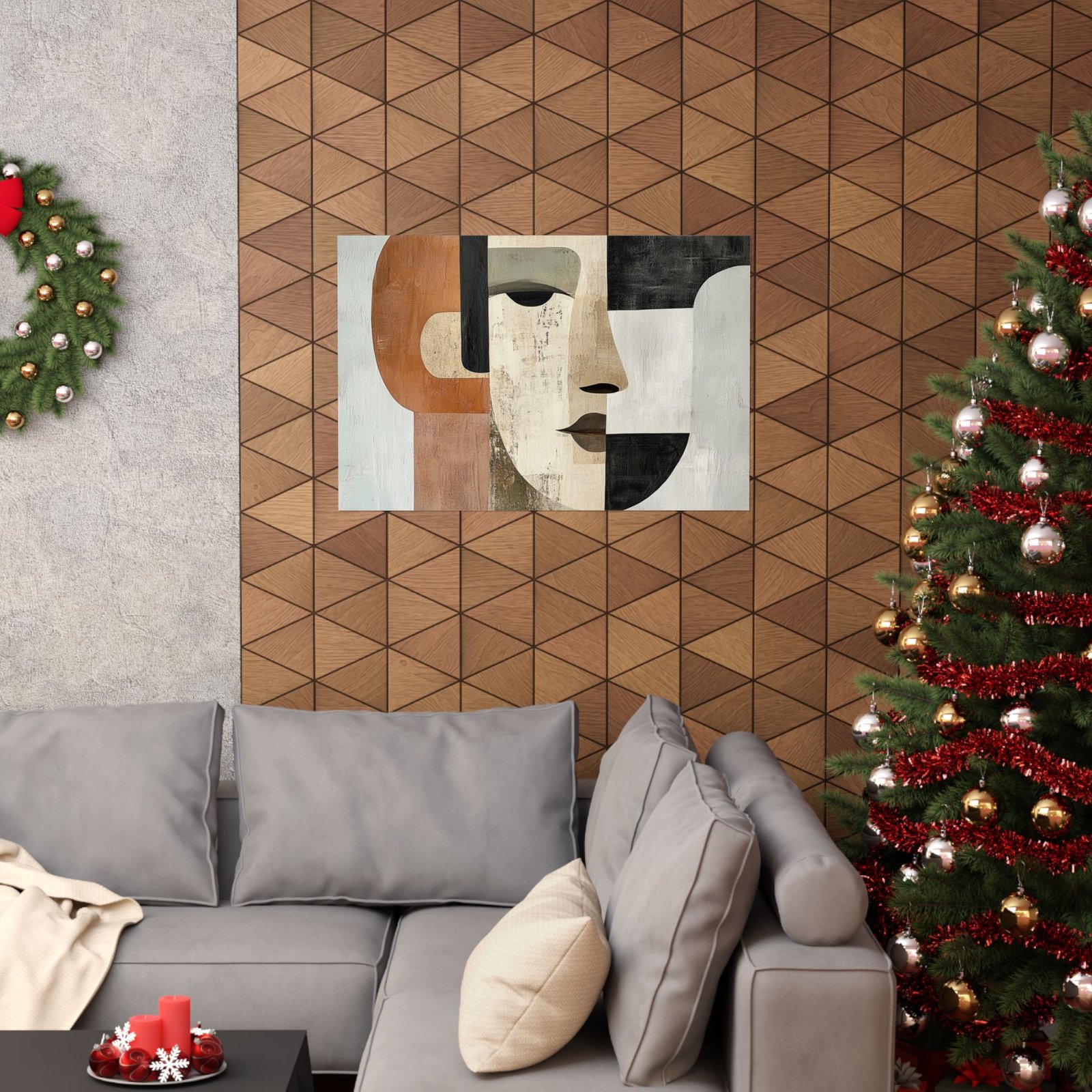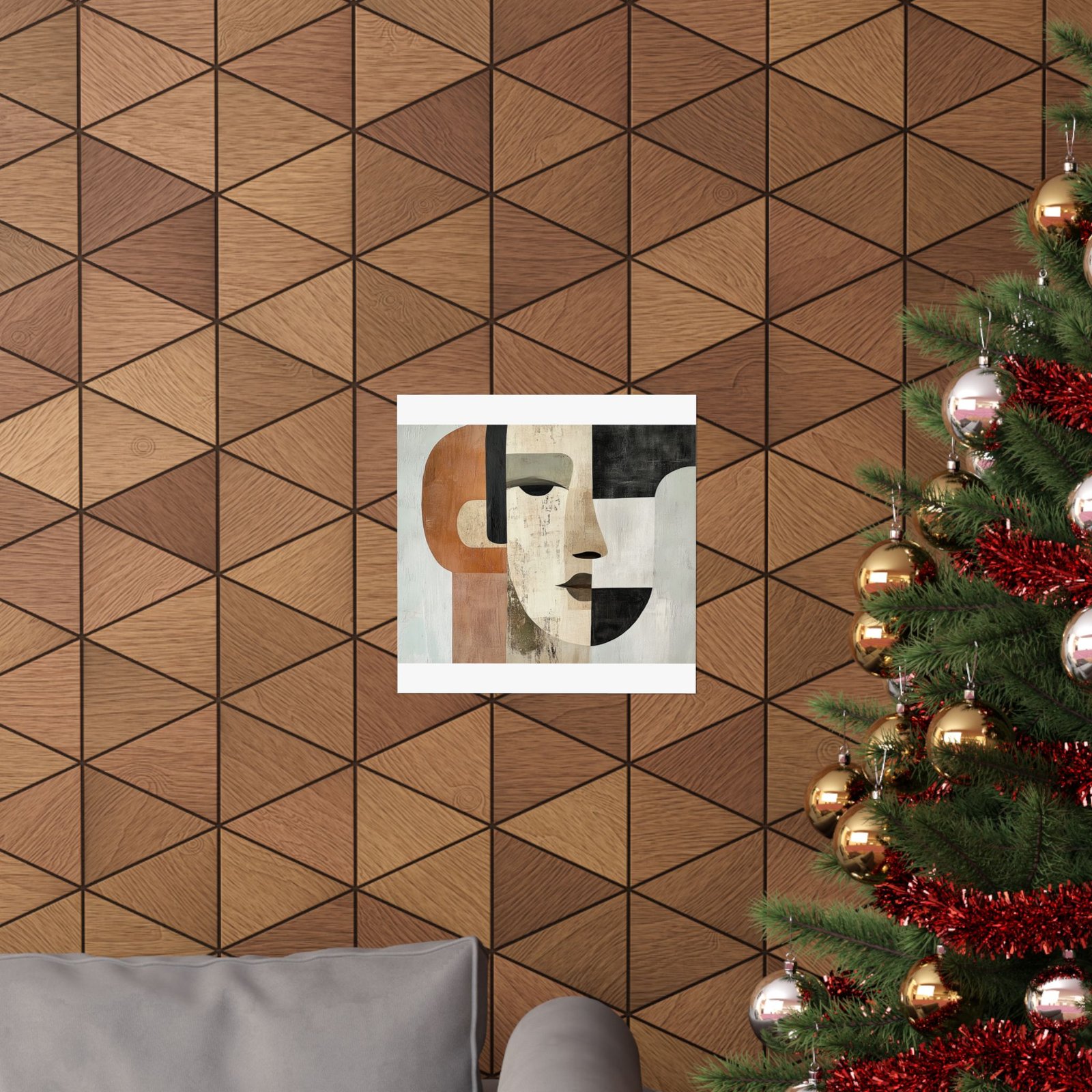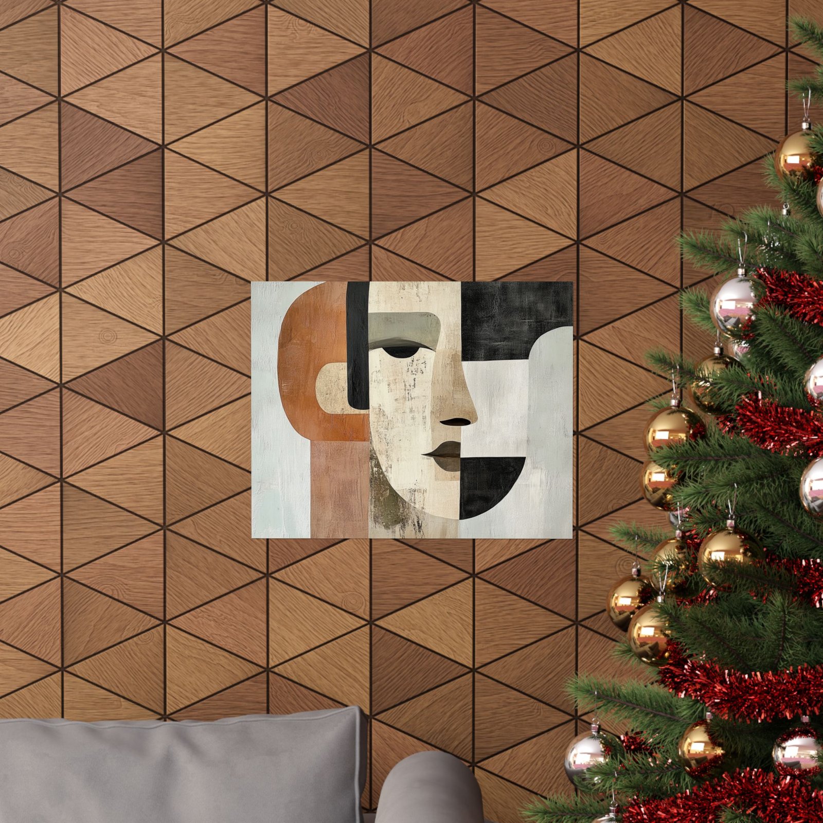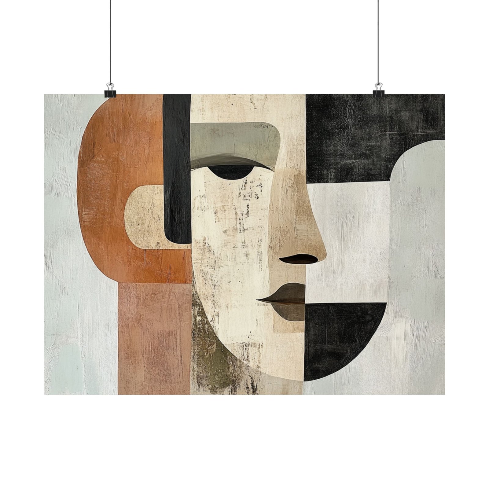 A study in contrast and balance, "Muted Symmetry" captures a serene face constructed from clean lines and textured geometry. With warm earth tones against cool neutrals, this piece invites reflection on duality, identity, and calm strength. It’s a quiet conversation between form and feeling—perfect for modern interiors that embrace depth without noise.