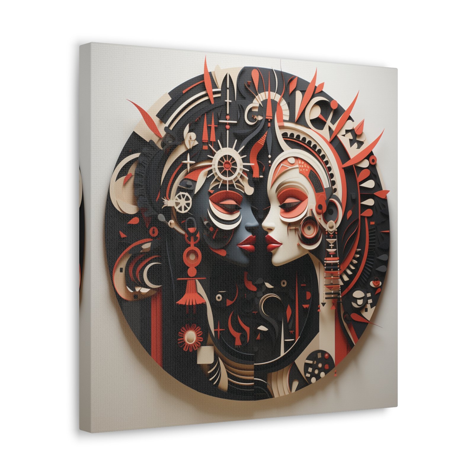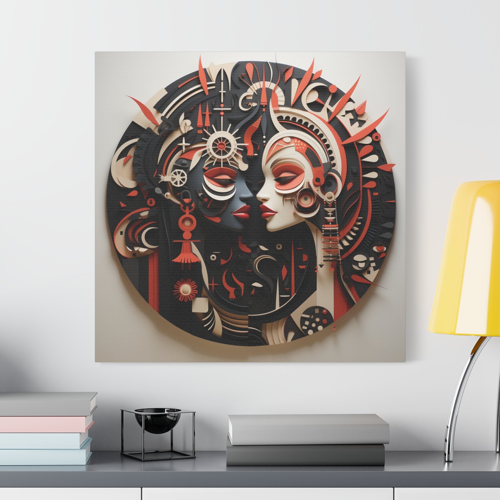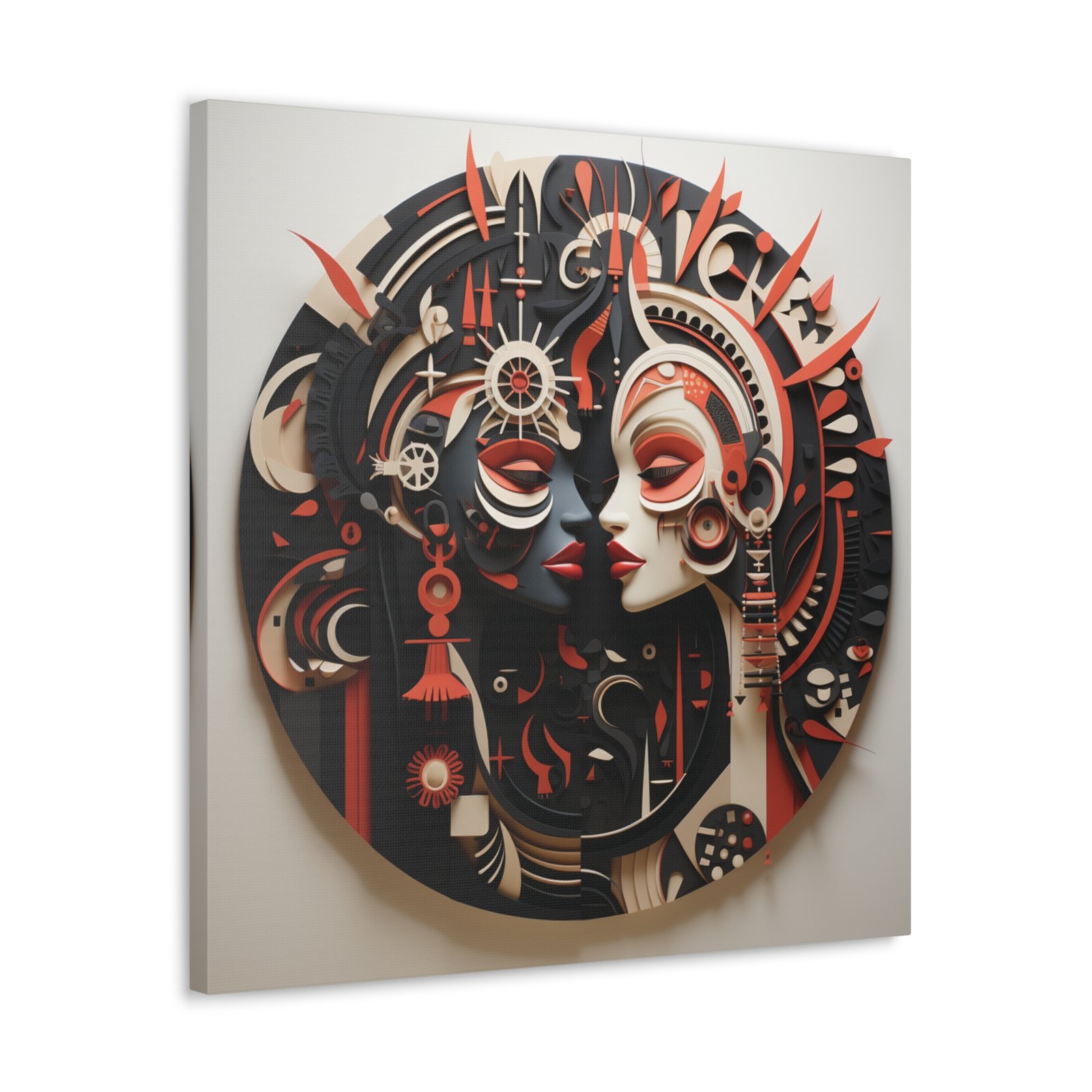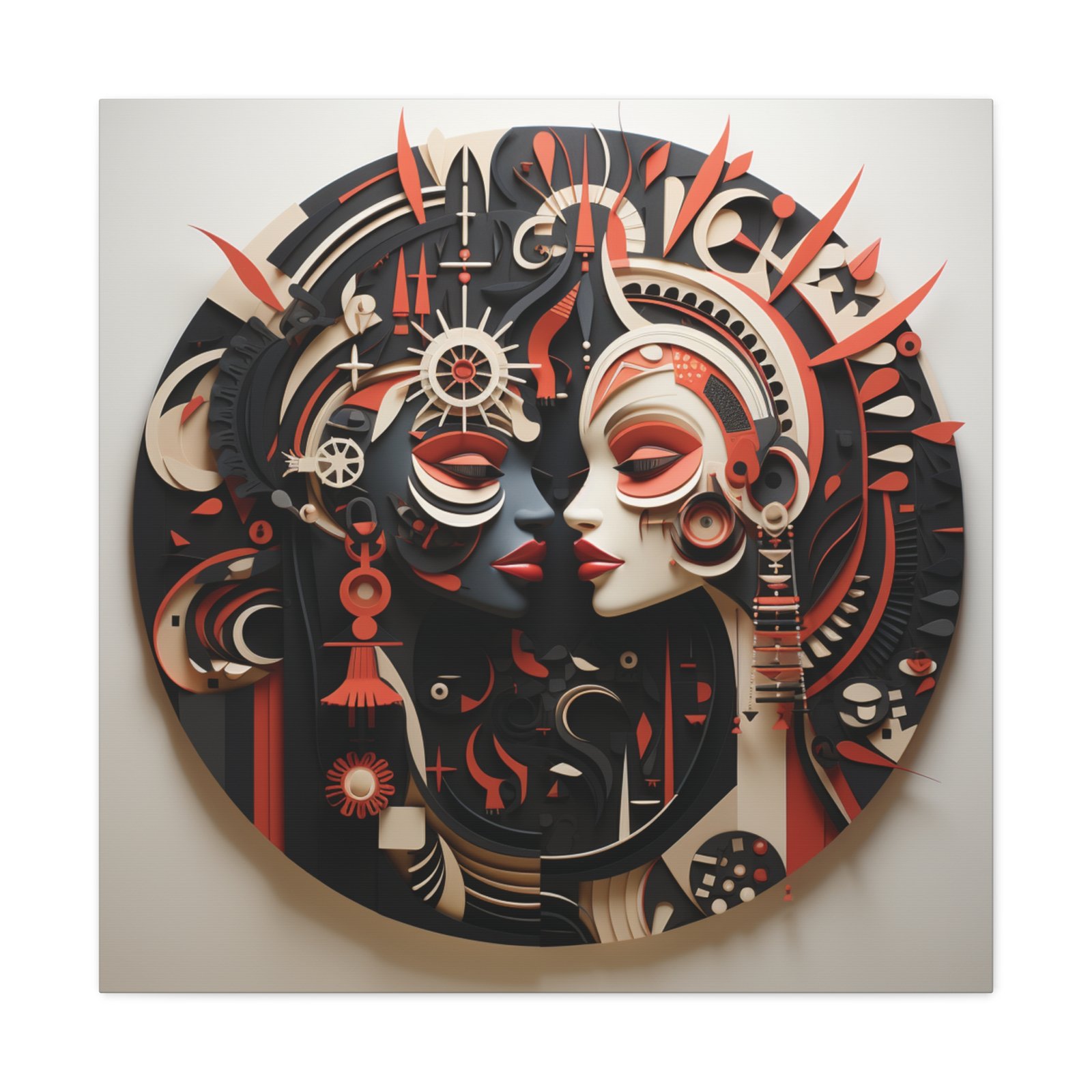 This artwork captures two celestial beings face-to-face, embodying unity through contrast. Their mirrored forms merge night and day, dark and light, into a single orbital dance of balance. Intricate tribal-futuristic motifs flow between them, symbolizing harmony, energy exchange, and the eternal bond between dual spirits.