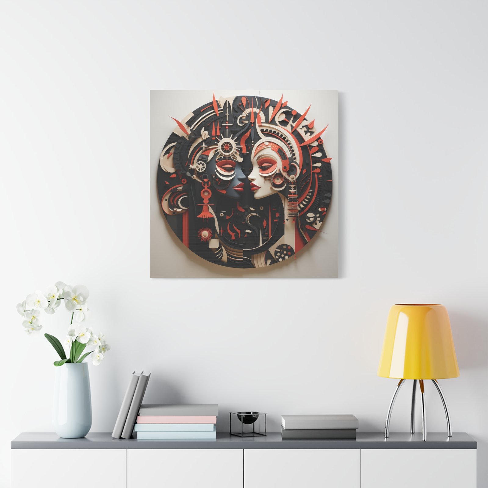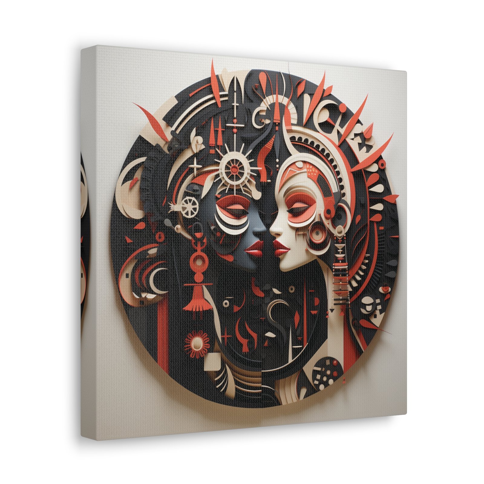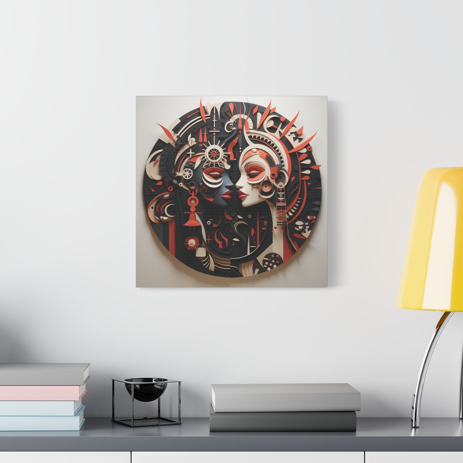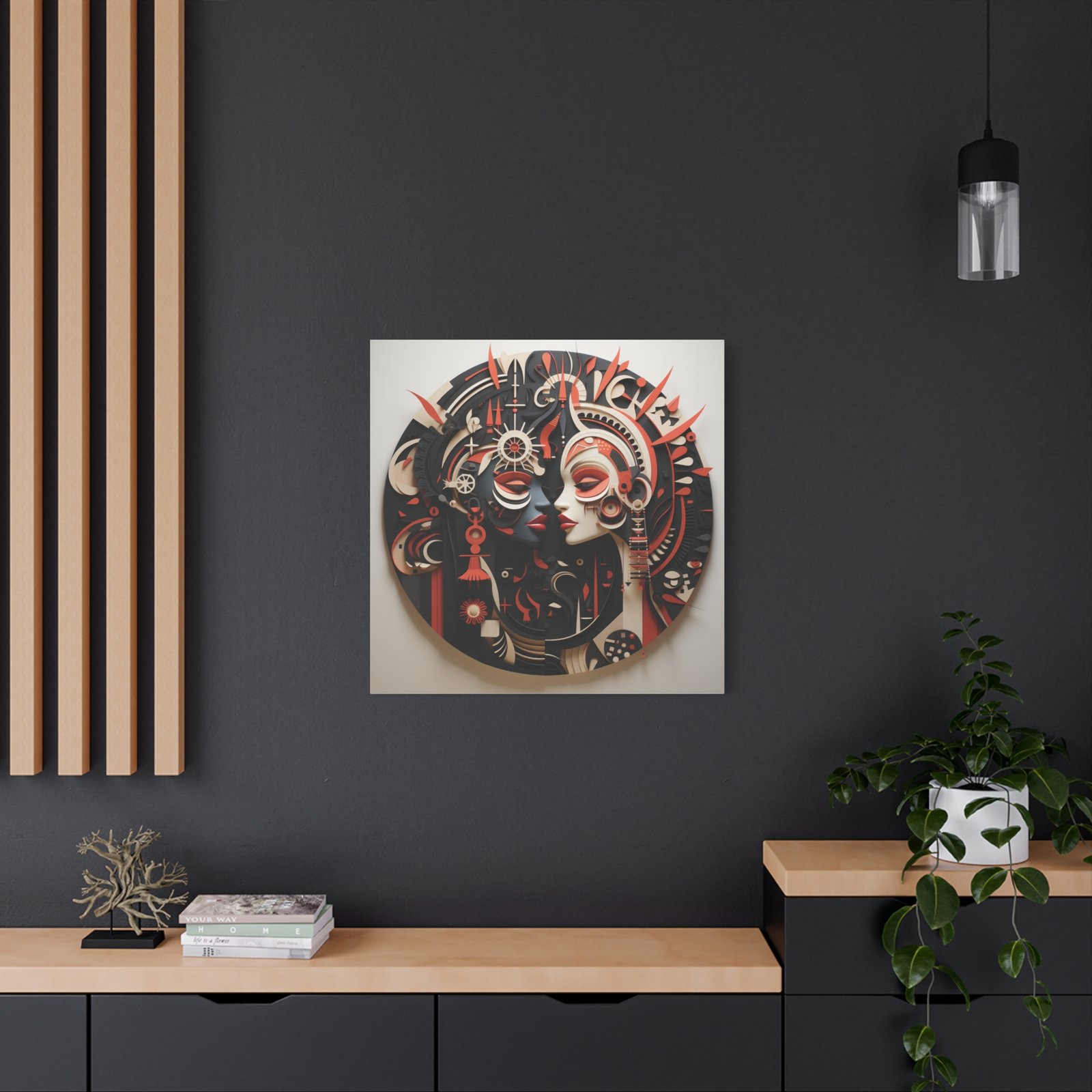 This artwork captures two celestial beings face-to-face, embodying unity through contrast. Their mirrored forms merge night and day, dark and light, into a single orbital dance of balance. Intricate tribal-futuristic motifs flow between them, symbolizing harmony, energy exchange, and the eternal bond between dual spirits.