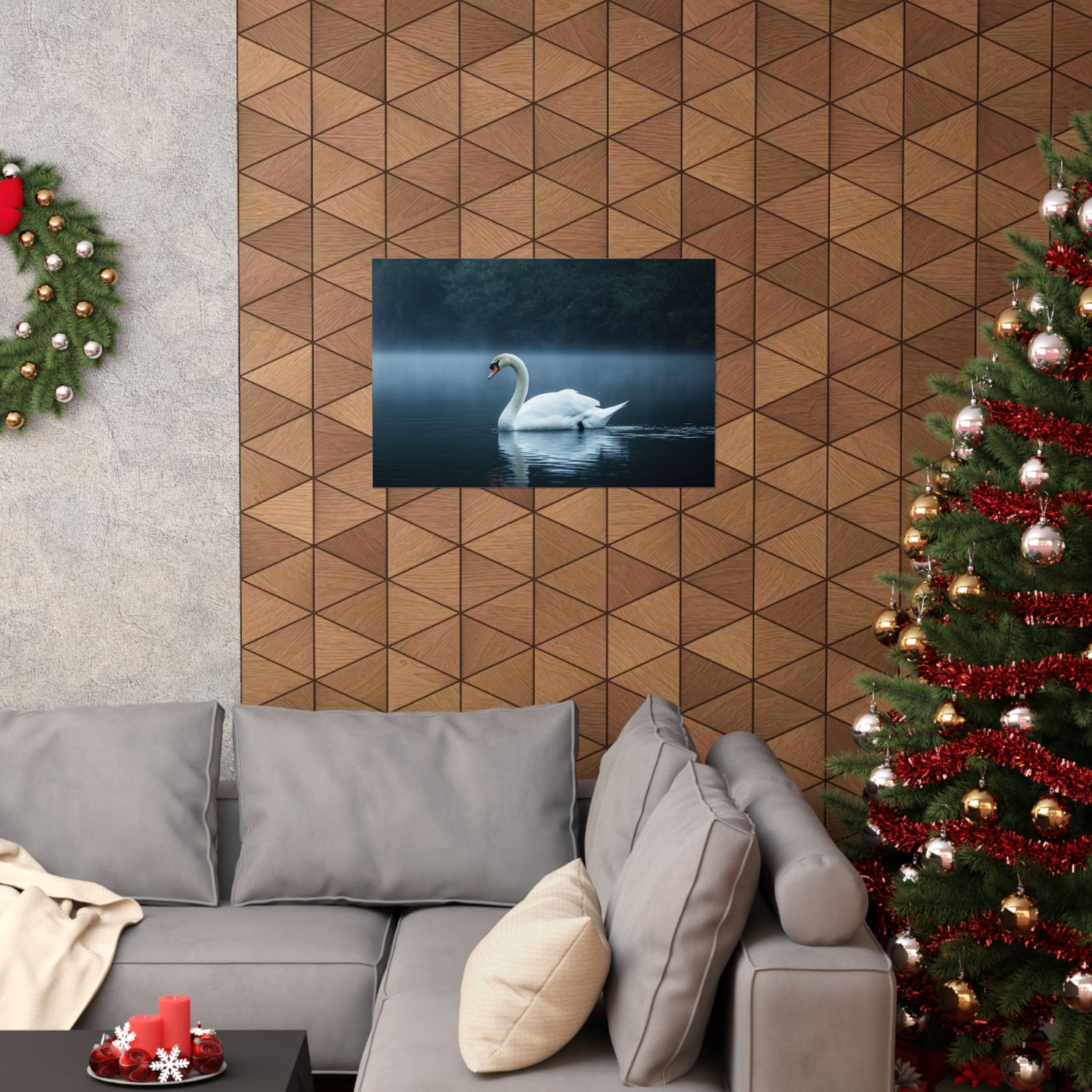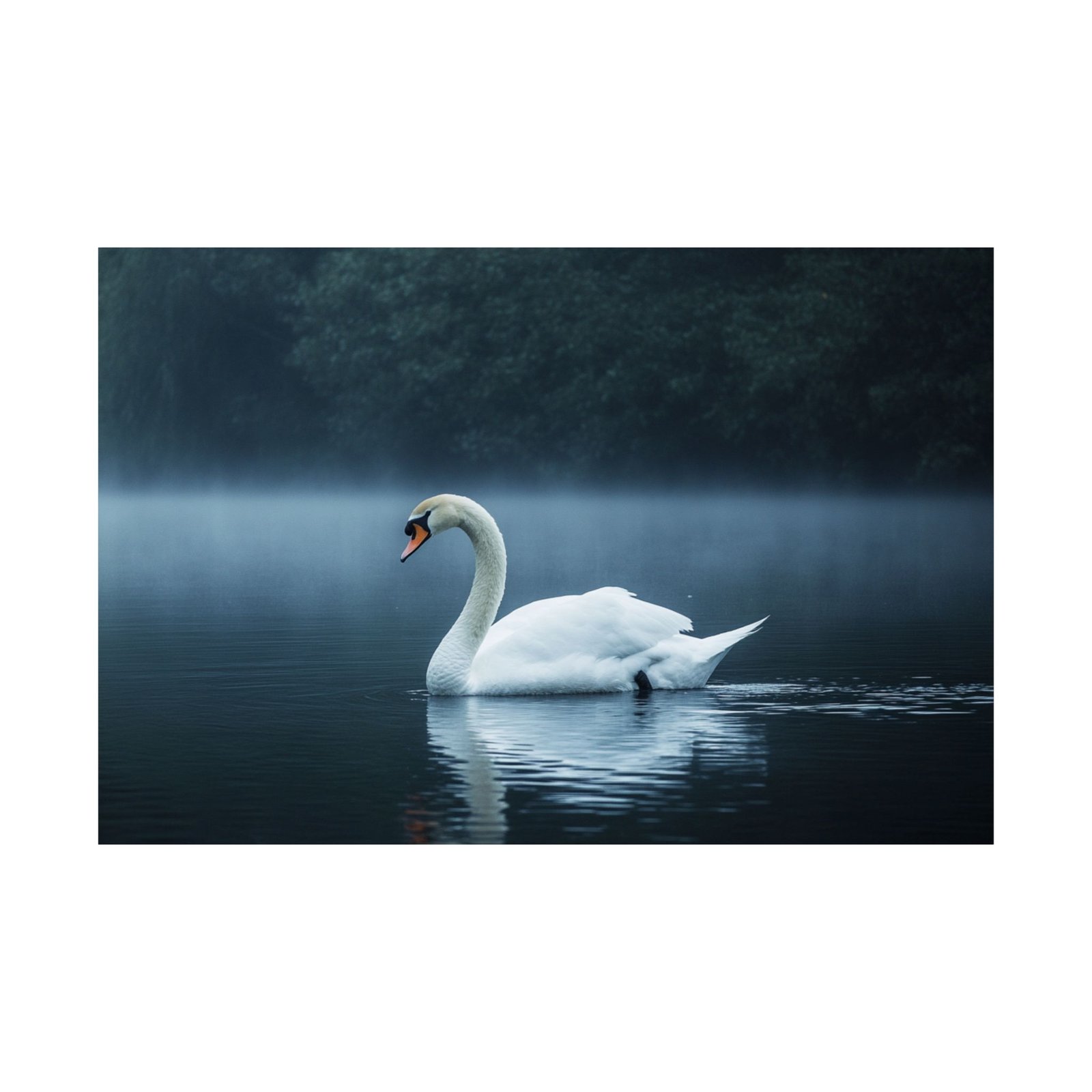 In Elegance in the Fog, a lone swan glides across a glassy lake, shrouded in soft morning mist. The rich blues and shadowy background evoke a sense of mystery and depth, while the swan’s graceful posture radiates calm power. A perfect piece for interiors that seek both sophistication and serenity.