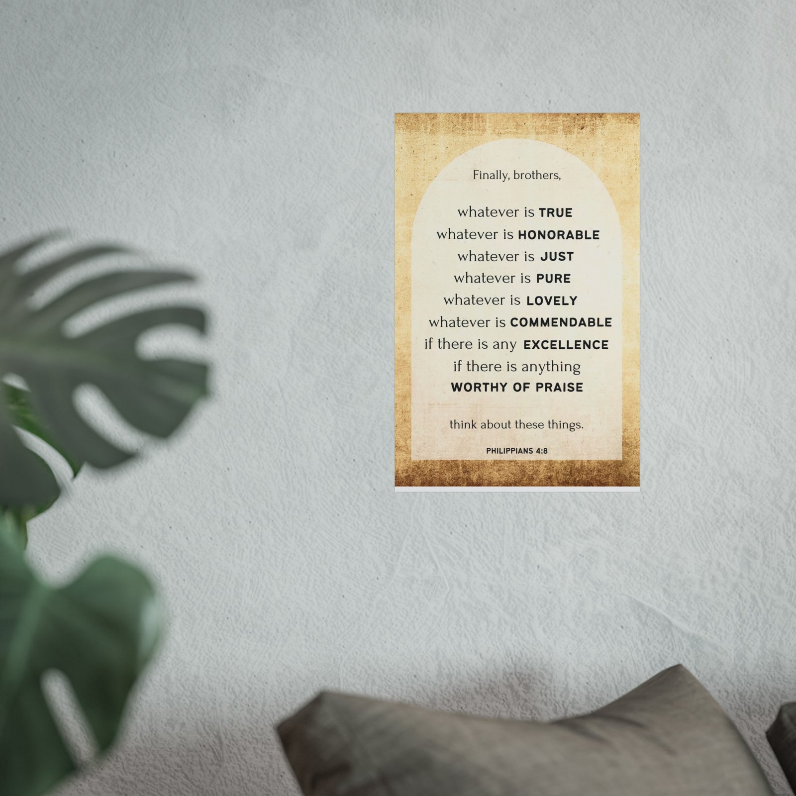 This Bible scripture poster serves as a daily reminder to focus on positive thoughts and clear the mind of negativity. It is perfect for those seeking inspiration and spiritual guidance, fitting well in a home office, bedroom, or study space. Relevant for Christian holidays, Sunday school teachers, and those looking to decorate their living spaces with meaningful art.