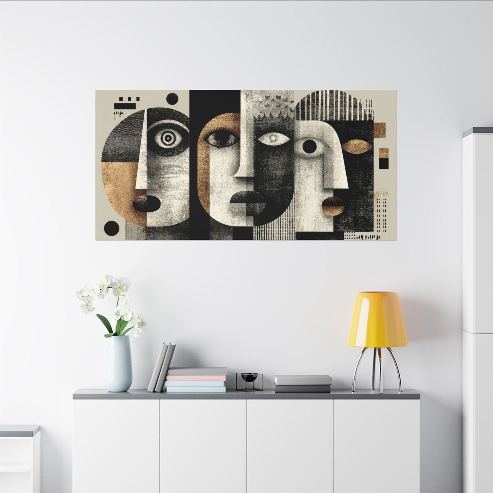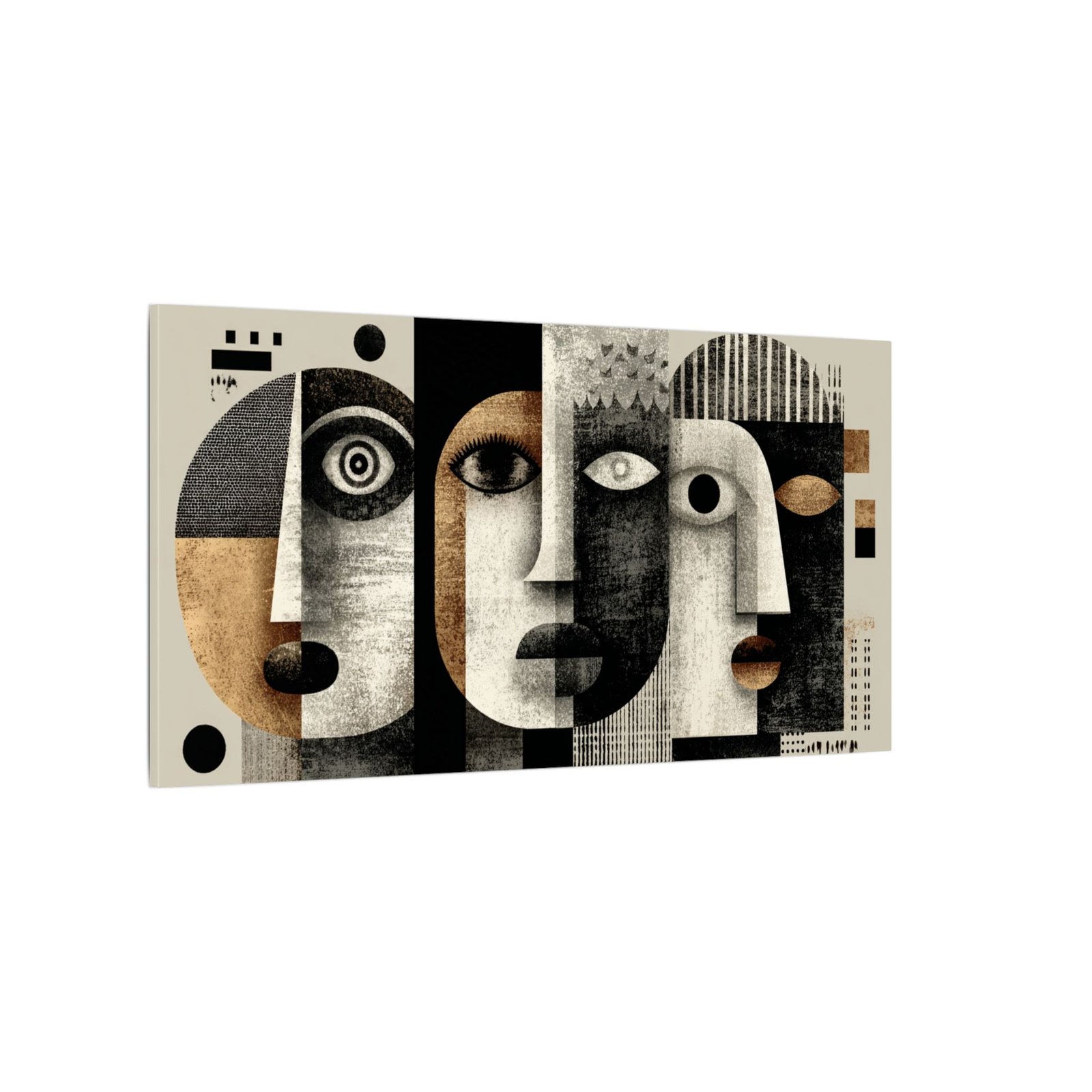 This stretched matte canvas brings a modern, abstract trio of faces into your space with quiet intensity. The layered textures—soft beiges, deep blacks, and warm ochres—feel both vintage and contemporary. Printed with non-toxic latex inks on a durable cotton-poly canvas and mounted on responsibly sourced radiata pine, the piece hangs flat and steady thanks to soft rubber grip dots on the back. It settles naturally into living rooms, creative studios, or a reading nook, inviting slow looks and conversation.